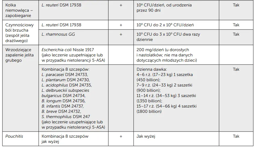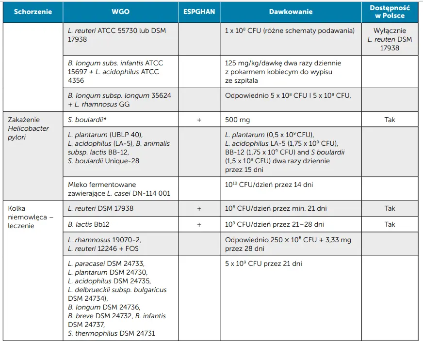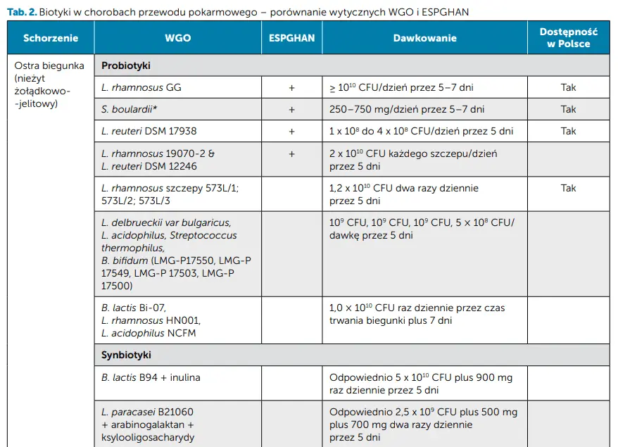 W 2024 r. opublikowano aktualizację wytycznych Światowej Organizacji Gastroenterologii (World Gastroenterology Organization, WGO) dotyczących stosowania probiotyków i prebiotyków u dorosłych oraz dzieci [8]. Szczegółowe wytyczne WGO dotyczące dzieci oraz ich porównanie z wytycznymi Europejskiego Towarzystwa Gastroenterologii, Hepatologii i Żywienia Dzieci (European Society for Paediatric Gastroenterology, Hepatology and Nutrition, ESPGHAN) [9] przedstawiono w tab. 2.