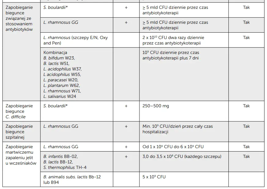 CFU (colony forming units) – jednostki tworzące kolonie * W wielu badaniach nie podano oznaczenia szczepu S. boulardii. Jednakże, jeśli było dostępne lub ocenione retrospektywnie, najczęściej używanym szczepem był S. boulardii CNCM I-745.